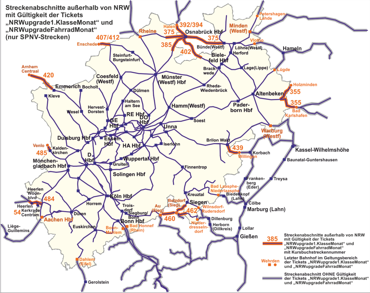 Außerhalb von NRW gilt das NRWupgradeFahrradMonat / NRWupgrade1.KlasseMonat in Zügen des Schienenpersonennahverkehrs nur auf bestimmten Strecken, sofern diese ebenfalls vom Basisticket (Deutschlandticket, Abonnement des NRW-Tarifs und der nordrhein-westfälischen Verbund- und Gemeinschaftstarife) abgedeckt werden.