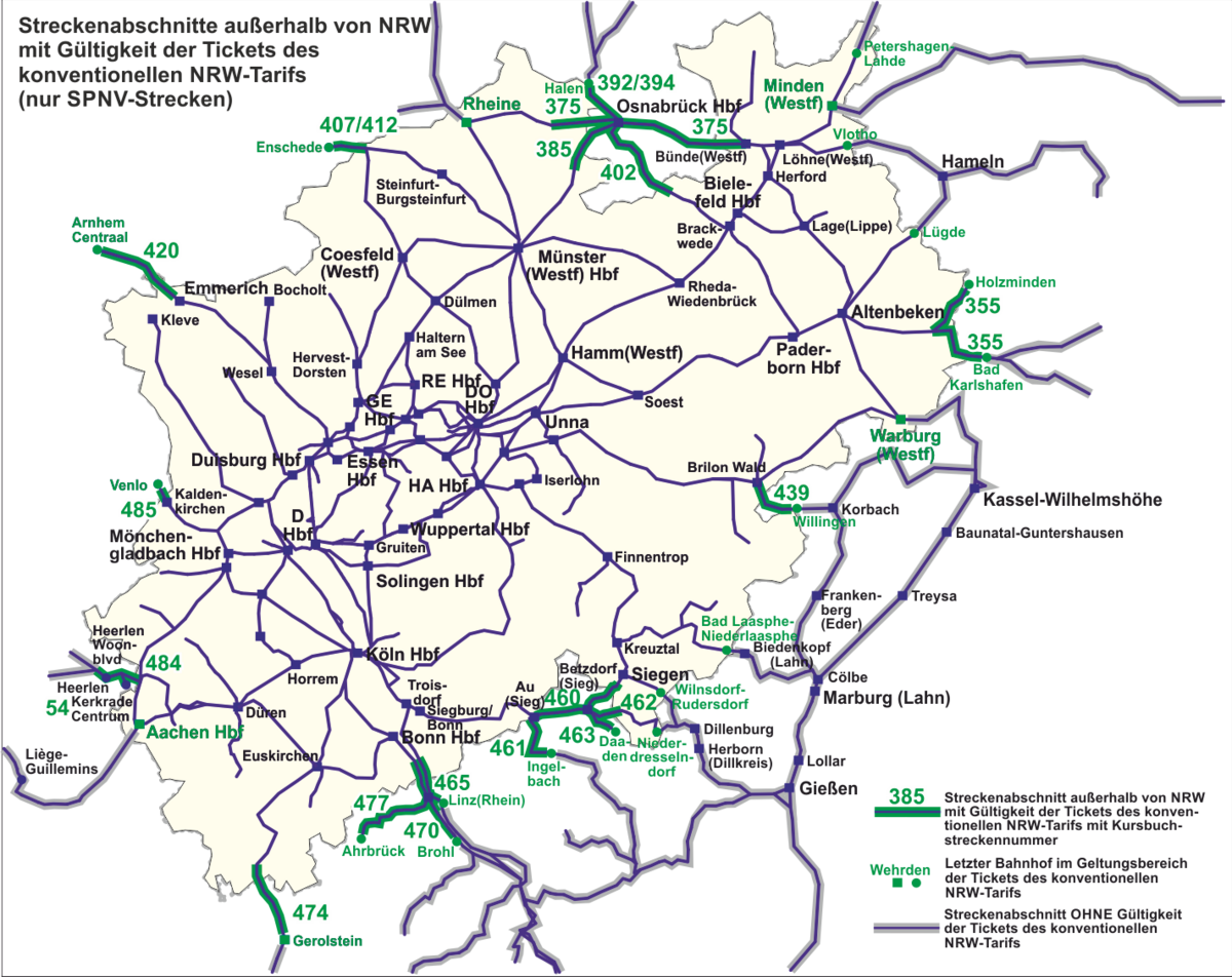 Außerhalb von NRW sind die Tickets des konventionellen NRW-Tarifs mit Ausnahme von NRWupgrade1.KlasseMonat, NRWupgradeFahrradMonat und SemesterTicket NRW auf einigen definierten Schienenstrecken gültig (siehe Tabelle 1 sowie in der Übersichtskarte).